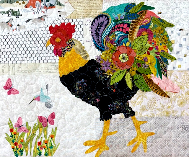Teeny Tiny Collage Patterns Group #6 which includes the rooster, hen, and bee. Do one or all three!! Learn the art of collage quilting from a certified Laura Heine instructor.
